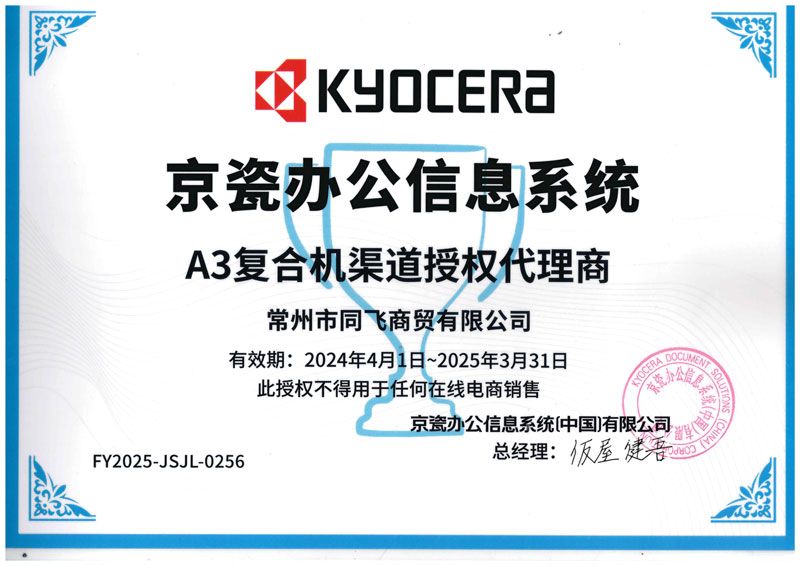 公司取得了日本京瓷復(fù)印機、打印機,映美針式打印機、天威耗材、安興紙業(yè)等眾多知名品牌常州地區(qū)代理權(quán)。